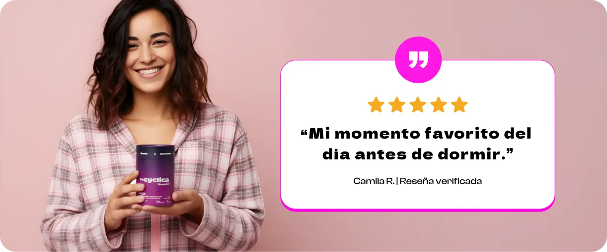 Semana 2-4: Tu ciclo hormonal se regula. Notas que incluso la semana antes del periodo (cuando antes no podías dormir) ahora descansas mejor. Menos irritabilidad, menos ansiedad durante el día.